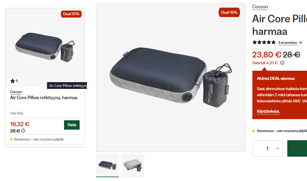 >>659097 Nyt tuo tyyny korjautui tuohon 31% ja yksi toinen tuote laski kanssa muutamalla eurolla, risukeitin sen sijaan ei muuttunut, haha
