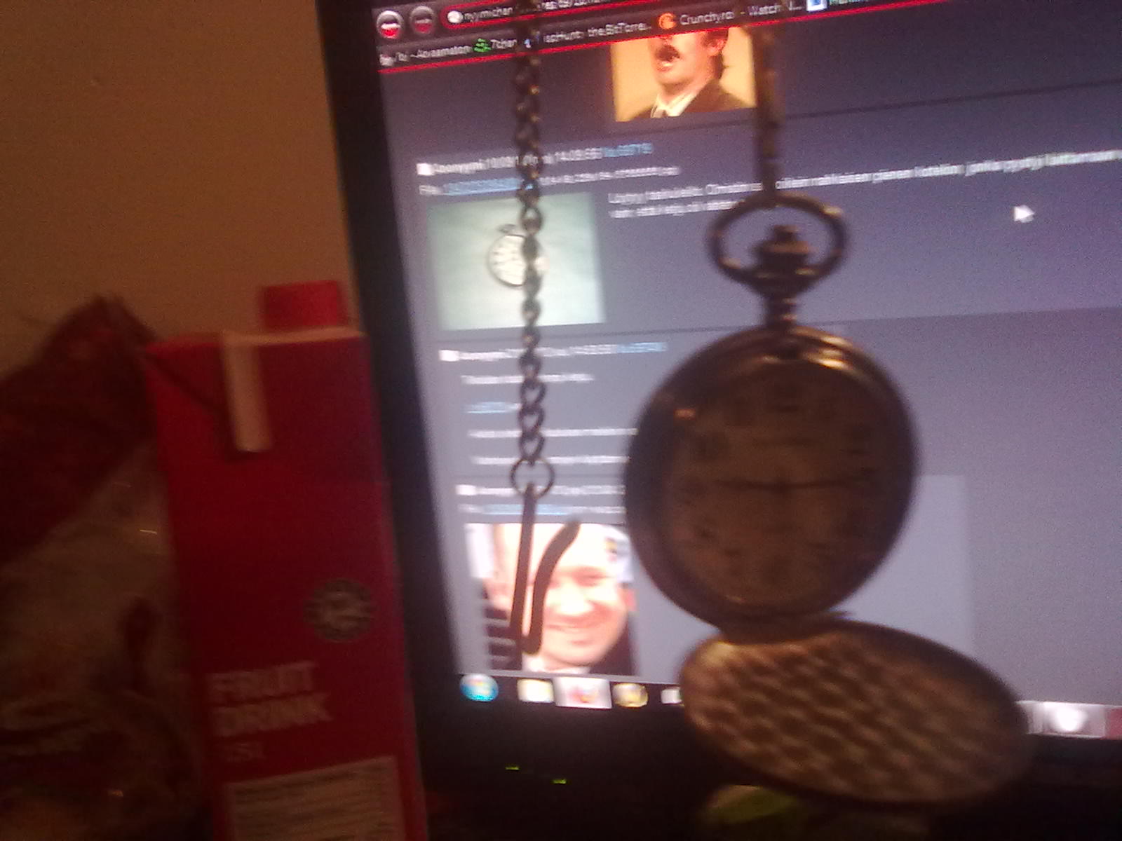 Sain kerran taskunauriin eräältä vanhemmalta herrasmieheltä tippinä, tässä se on tietokonepöydällä lojunut siitä asti. Sillon kun sain sen, se oli vielä ajassa ja vedettynä, vaan ei ole enää. En ole jaksanut vetää sitä ja en tiedä miten sen saisi aikaan (muuten kuin odottomalla kellon näyttämää aikaa ja vetämällä vasta sitten, mutta se olisi liian vaivalloista). Kaveri arvioi sen olevan messinkiä, tarkoitus oli käydä paikallisessa kelloliikkeessä arviouttamassa hinta, jos siitä vaikka muutaman kympin saisi… vaan en ole jaksanut, vaikka kello on ollut tuossa kohta puoli vuotta.