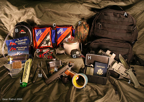 Red Bull tölkki (tilanne kuitenkin iskee päälle kun nukut ja sut herätetään sireeneillä tai jotain), sorkkarauta, vaihtovaatteet, tulentekotarpeet, ruokaa, haavasuihke, pieni ensiapukitti, ompelutarvikkeet, leatherman, yleisimpiä lääkkeitä mitä itse tarvii, bussilippu, rahaa, kofeiinitabletteja, desinfiointiainetta/suihke, saippua, kertakäyttösadetakki. Kamera, kännykkä, ehkä jopa varakännykkä ja liittymä, koska nykyään hyvillä tilannekuvilla voi tehdä rahaa.